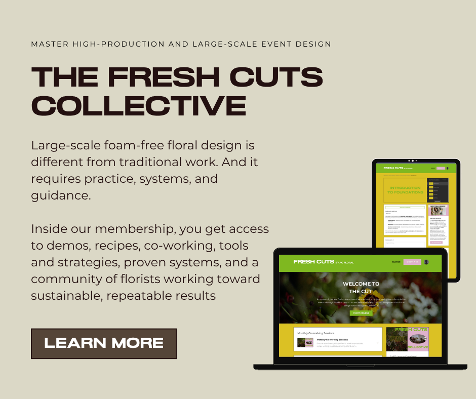 Bundle our Foam Free Design guides from centerpieces to installations for the Complete Guide to foam free Floristry! Learn how to create stunning designs while earning rental income and prioritizing your recurring supply expenses! From choosing reusable materials to reducing waste in every aspect of your work, this guide covers everything from avoiding floral foam to repurposing mechanics and implementing sustainable delivery and setup systems. Perfect for florists, event designers, and flower enthusiasts alike, it’s your ultimate resource for combining artistry with environmental responsibility. Let’s redefine floristry—one bloom at a time! 🌿💐✨