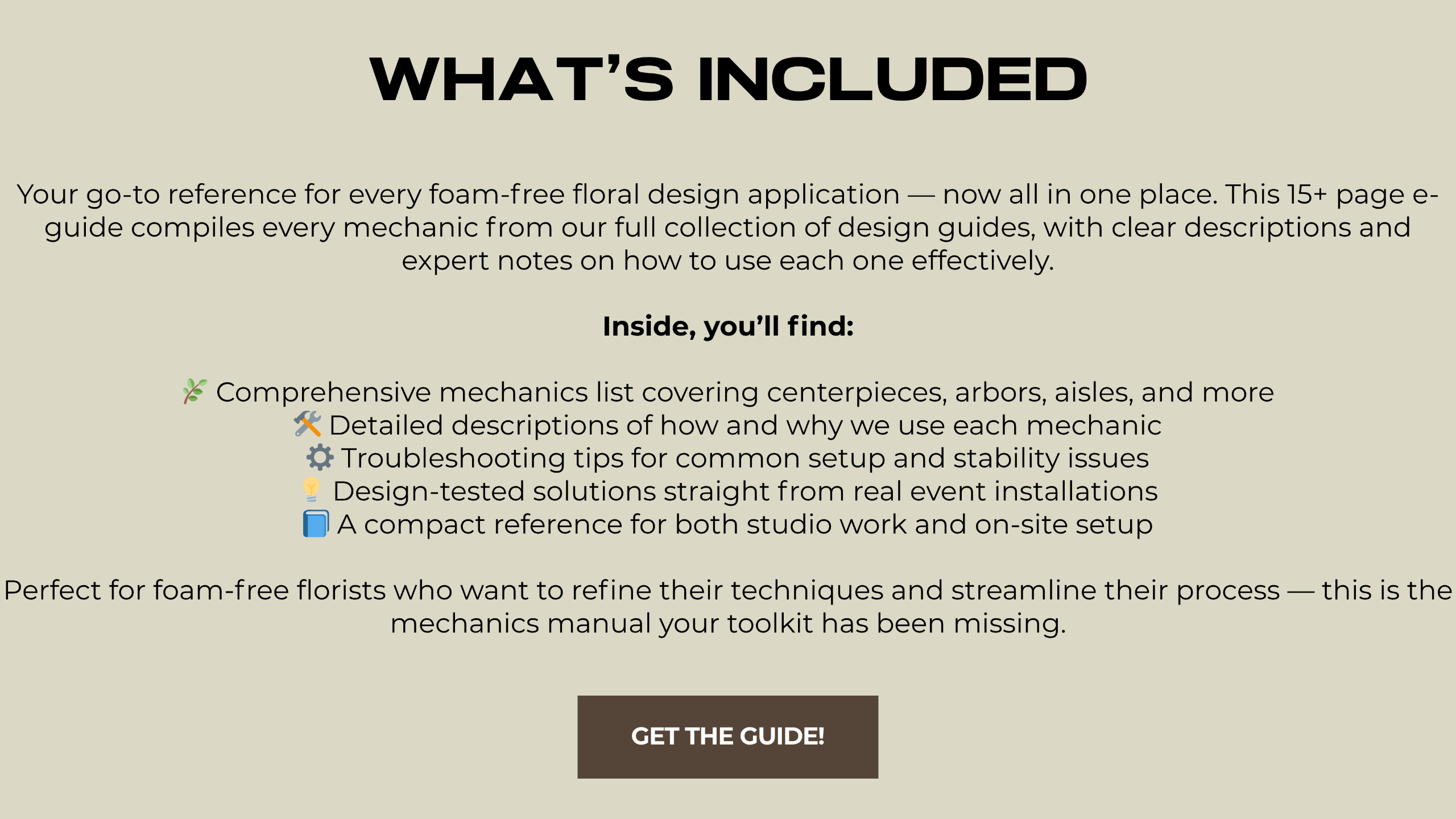 This guide is the essential resource for sustainable florists who want to design confidently and professionally without floral foam. Inside, you’ll find over 15 pages of proven, eco-conscious mechanics pulled from our full collection of design guides — all organized in one place for quick reference. Each mechanic includes clear descriptions of how and why we use it, plus troubleshooting tips for common setup and stability challenges. Whether you’re designing centerpieces, large-scale installations, or aisle arrangements, this guide will help you create secure, long-lasting, and environmentally responsible designs with ease. It’s a must-have companion for florists who value both artistry and Foam-Free — giving you the confidence to design beautifully, build efficiently, and protect your profits while staying true to your values.