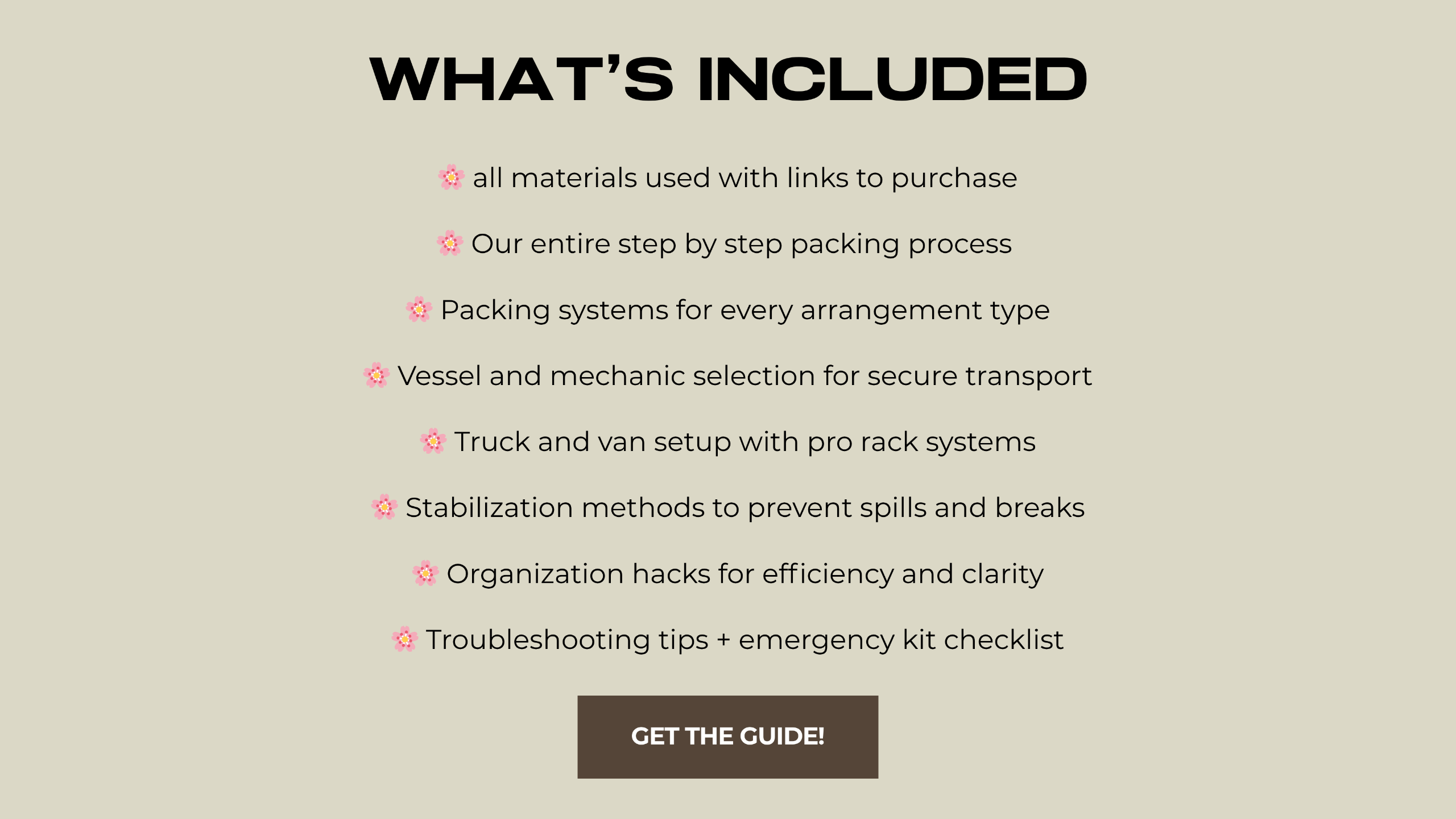 You’ve poured your heart into creating foam-free floral designs—don’t let transport be the reason they fall short. From water spills to broken stems, one bump in the road can undo hours of work (and cut into your profits). our Foam-Free Floral Transport Guide shows you exactly how to pack, stabilize, and deliver arrangements of every size with confidence. Inside, you’ll find pro-tested systems for choosing the right totes and racks, setting up your truck or van, and preventing costly mishaps before they happen. With clear strategies for efficiency, organization, and troubleshooting, this guide ensures your designs arrive flawless, and hydrated—so you can focus on wowing your clients instead of worrying about logistics.